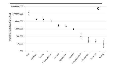 A new study finds an estimated 105–348 million birds in Canada each year are killed by domestic cats, making these pets and their feral compatriots the biggest human-related threat to wild birds—more lethal by far than large office buildings and wind turbines, which sometimes take the blame.