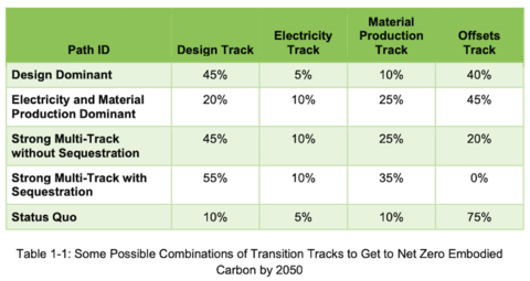 The plan starts with architectural design, according to the paper, which identifies four “tracks” for carbon reductions and four “paths” that combine differing intensities of each track to achieve net-zero carbon (see chart). The four tracks are: