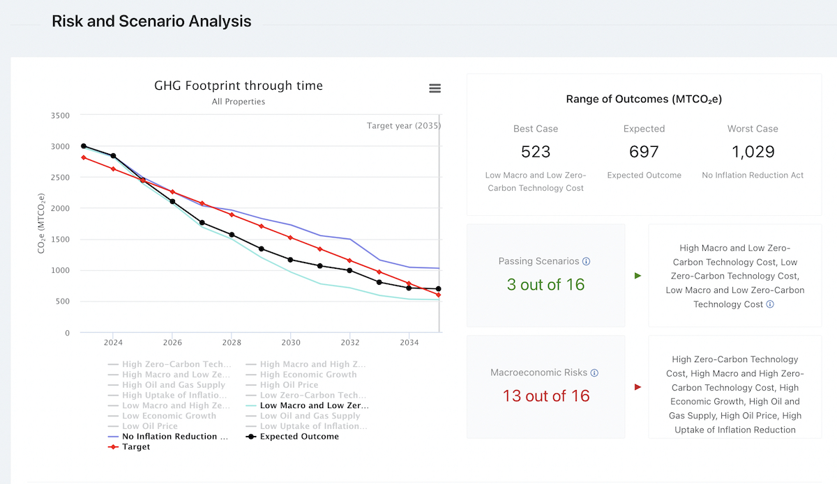 Decarbonization roadmaps project whether the portfolio, with the chosen interventions applied, will meet the owner’s decarbonization targets. These projections encompass multiple scenarios—like what would happen if the Inflation Reduction Act were repealed or had low uptake, or how rapidly the cost of zero-carbon building technologies is likely to come down.