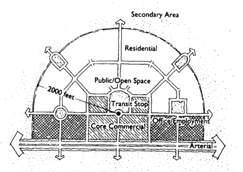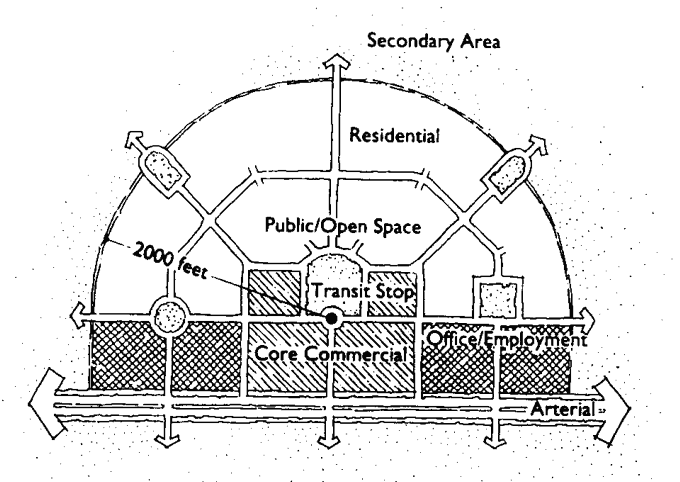 Modeled after A Pattern Language by Christopher Alexander et al., the book’s main part, entitled “Guidelines,” is broken up into a series of short patterns for community design. The guiding principle throughout is that residents shouldn’t be dependent on cars to get around. To this end Calthorpe offers a sequence of design models he calls “transit-oriented development.” These models vary according to density and proximity to an urban core, but they all center around the rail station or bus stop. Commercial areas, residential areas, public spaces, services, and circulation patterns are all designed to provide maximum access within a reasonable walking distance.