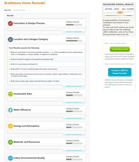 After signing up and starting a project, users can choose one of two options: a “quick score” or a credit-by-credit analysis. The quick-score tool asks approximately 20 non-technical questions, alerting the user along the way if a design choice might disqualify a project from LEED for Homes certification, and produces a rough estimate of the project’s likely certification level along with a jargon-free list of actions the user would have to take to earn the predicted LEED certification. The quick score might give less experienced users a sense of green design options, and could also help a design team decide on a realistic certification target very early in the process.