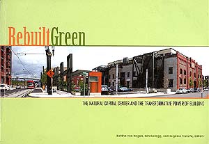 Rebuilt Green. Instead of highlighting the building’s attractive front façade, the book’s unassuming cover shows a panorama of the immediate area, placing the Natural Capital Center visually and symbolically within its surrounding community. Similarly, the book takes its description beyond the physical boundaries of the building, embracing and explaining the larger context of sustainability.