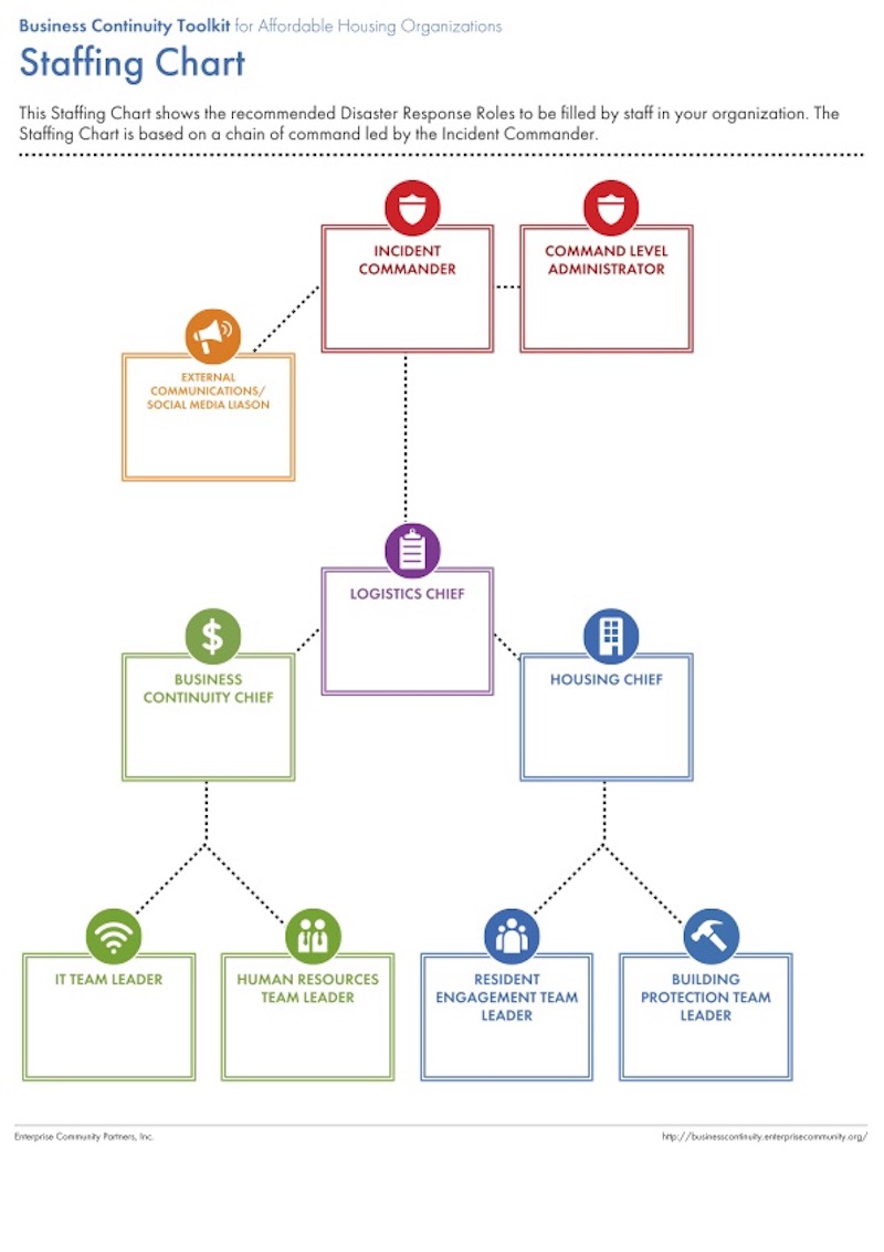 The tools help teams set up a role structure within the organization that includes an emergency preparedness coordinator (who’s responsible for putting the plan together and maintaining it), as well as an incident commander, external communications chief, logistics chief, housing chief, and business continuity chief. Also provided are role descriptions and action checklists, along with a tabletop exercise so teams can practice their response.