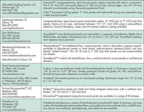 EBN issue ten years ago, Alex Wilson wrote, “If the building industry adopts these products there will likely be some large players getting involved,” and “Straw-based particleboard products . . . will likely lead the pack.” How have those predictions worked out? Last year, Dow BioProducts produced 100 million ft2 (9,300,000 m2) of straw-based particleboard, with a projected annual growth of 25%.
