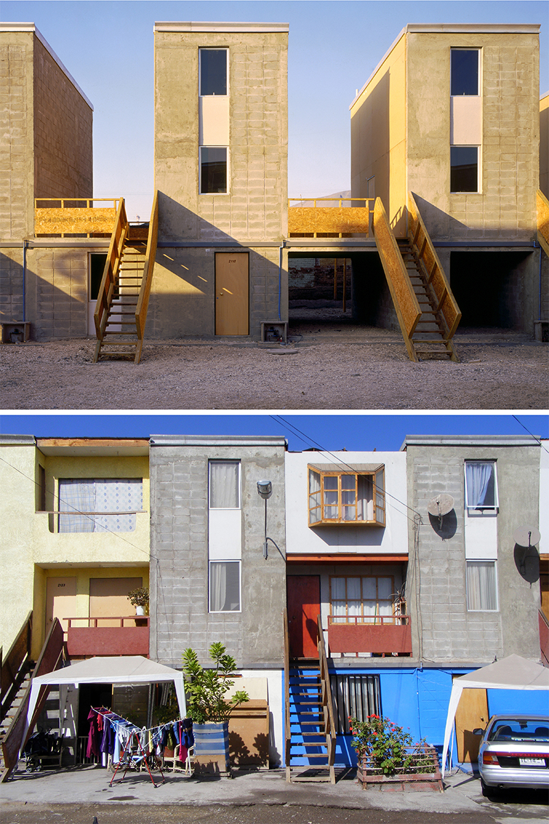 A view of the Quinta Monroy housing project in Iquique, Chile, before and after the families have moved in and expanded their homes.