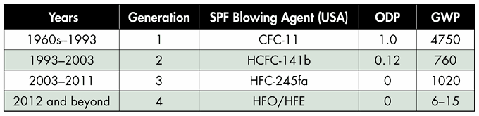 Fourth-generation blowing agents for SPF, with significant reductions in GWP, are not fully reported. During the past two decades, blowing-agent manufacturers have worked diligently to reduce the environmental impact of these chemicals in regard to ozone depletion and greenhouse gas production. A brief summary of this development is provided in Table 1.