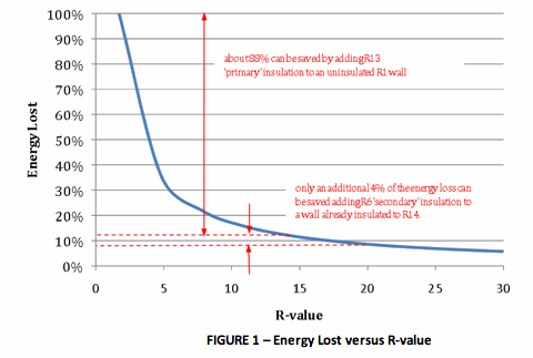 The relationship between conductive energy loss of a building and its envelope R-value is inherently non-linear, as shown in Figure 1. The example in this figure it is assumed that the uninsulated wall has an R-value of 1. At this R-value, the energy loss of the wall is assumed to be 100%. If a continuous R-13 primary insulation is added, the energy loss from the insulated wall will be reduced by about 86% of its uninsulated value. If an additional R-6 of ‘secondary’ insulation is added to the wall with R-13 of primary insulation, an additional 4% energy savings will be realized.