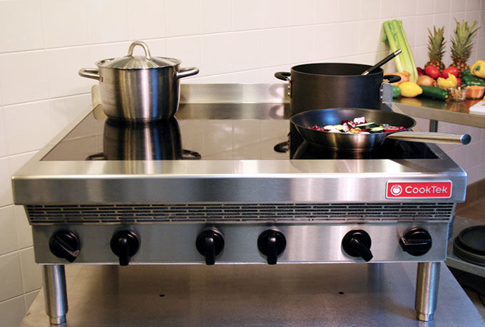 Product Guide Ranges & Cooktops CookTek 3,500-watt induction hobs, or burners, can heat ferromagnetic pans to 500˚F (260˚C) without heating utensils, and the glass surface stays cool to the touch so food doesn’t burn and stick to the surface. Photo: CookTek Behind the recommendations Related articles Behind the recommendations Related articles Ranges & Cooktops Commercial-scale induction ranges designed to reduce indoor emissions and ventilation requirements More about Ranges & Cooktops Commercial Kitchens: Cooking Up Green Opportunities Venting about Sustainable Commercial Kitchens Recovering Heat from Commercial Kitchen Exhaust Safe, All-Electric "Induction" Cooking: Try This At Home Commercial Induction Ranges from CookTek